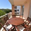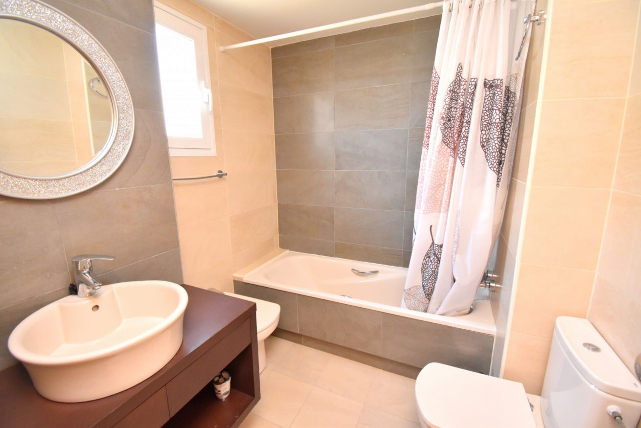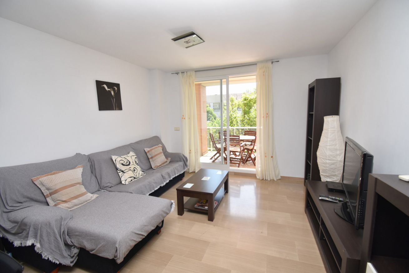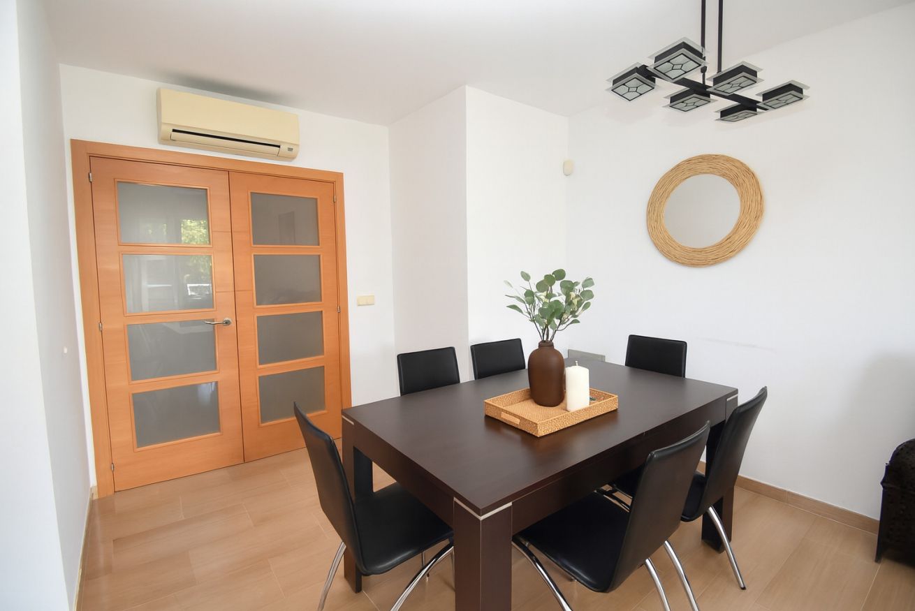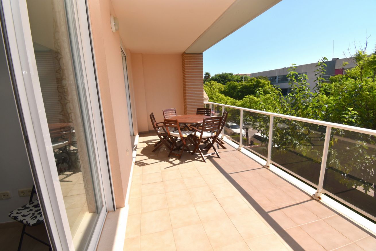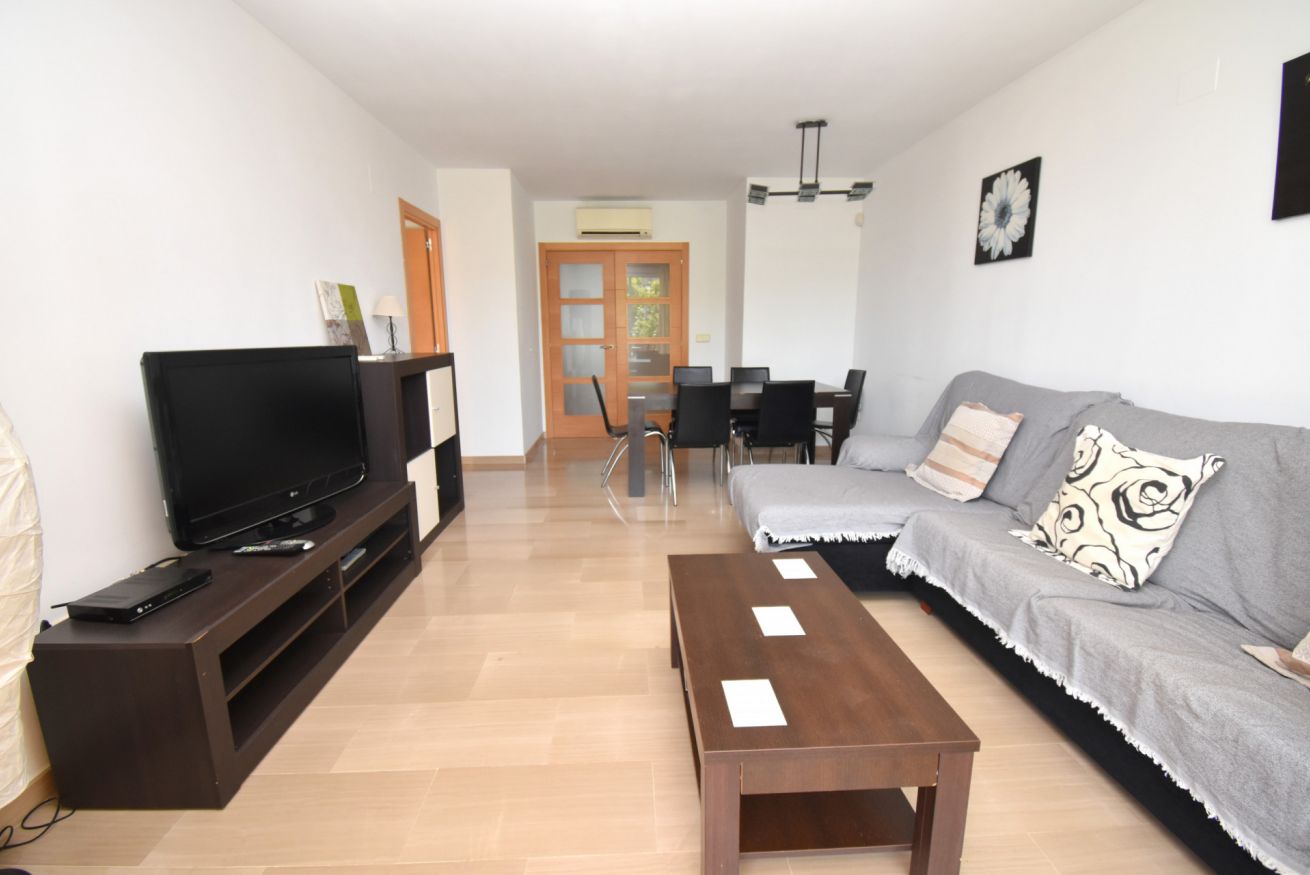 Con capacidad para hasta 6 personas, el apartamento dispone de internet Wi-Fi, un amplio salón-comedor con sofá grande, televisor de plasma, reproductor DVD, aire acondicionado (frío/calor) y puertas correderas que dan acceso a una terraza cubierta amueblada, perfecta para disfrutar del clima mediterráneo.