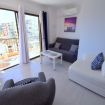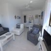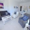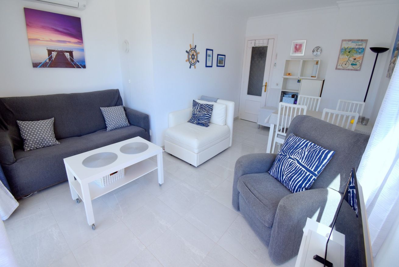 Con capacidad para 2 personas, el apartamento dispone de un salón-comedor acogedor con sofá, dos sillones, televisor de pantalla ancha, mesa de comedor para cuatro personas, aire acondicionado, ventilador de techo y puertas correderas que dan acceso al balcón privado con muebles de jardín, ideal para disfrutar del clima mediterráneo.