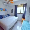 Dormitorio principal con cama extragrande (super king size), aire acondicionado, ventilador de techo, televisor y persianas en las ventanas.