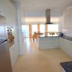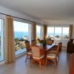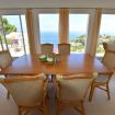Comedor independiente frente a la cocina, con mesa de comedor, muebles de mimbre y puertas corredizas que conducen a un balcón con vistas al mar.