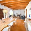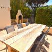 Terraza junto a la cocina con barbacoa de piedra, gran mesa de madera y sillas