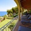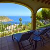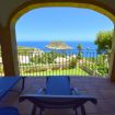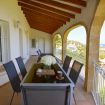Terraza cubierta con muebles de jardín y vistas panorámicas al mar.