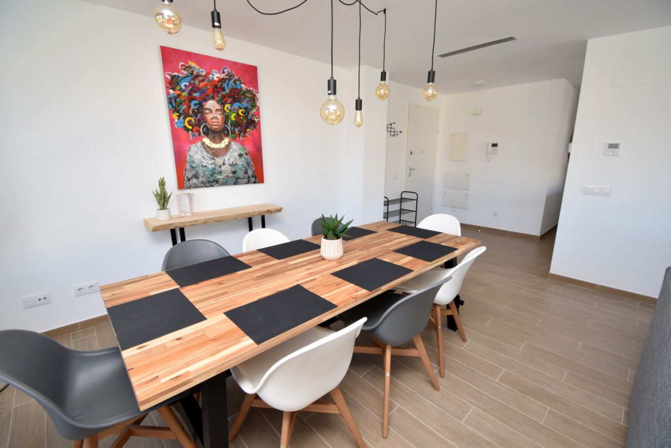 El amplio salón-comedor dispone de un gran sofá, televisor de pantalla ancha, mesa de comedor para seis personas, aire acondicionado y acceso directo a la terraza mediante puertas correderas con persianas eléctricas.
