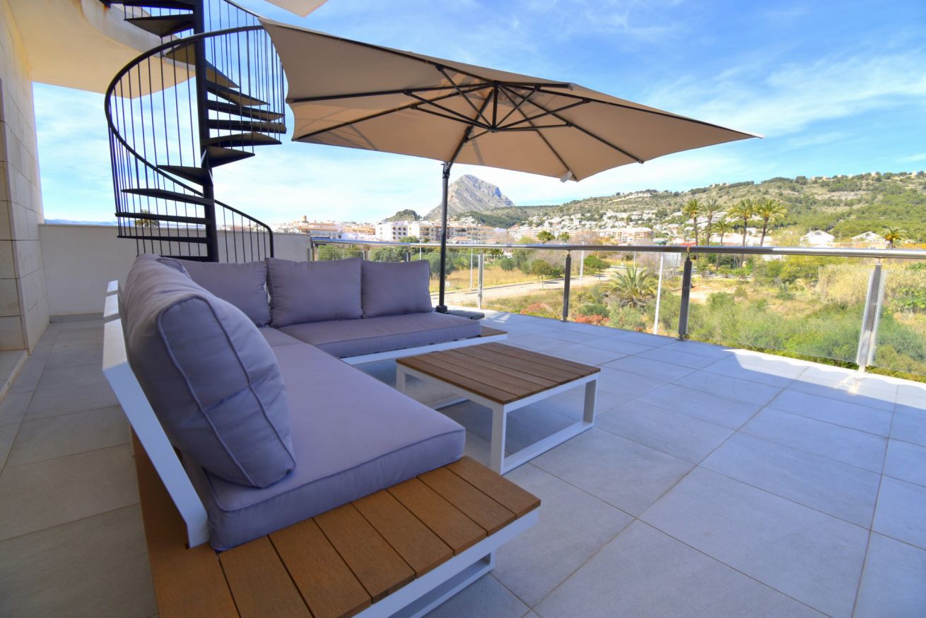 Azotea privada, accesible por escalera de caracol, con dos tumbonas y vistas panorámicas sobre Jávea.